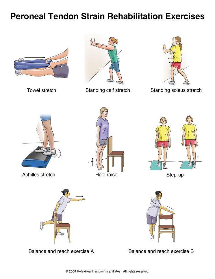 • Towel stretch: Sit on a hard surface with one leg stretched out in front of you. Loop a towel around your toes and the ball of your foot and pull the towel toward your body keeping your knee straight. Hold this position for 15 to 30 seconds then relax. Repeat 3 times.