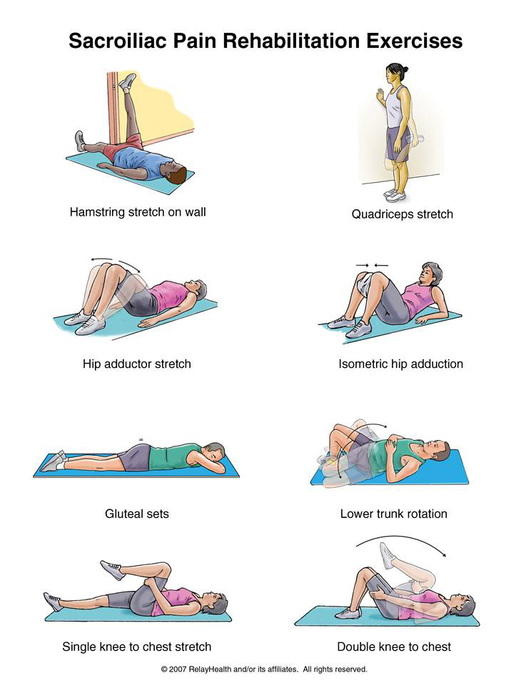 These exercises are designed to gently move your sacroiliac joint. Do not do these exercises if they cause any pain or discomfort. If your pain continues see your healthcare provider or physical therapist as soon as possible.